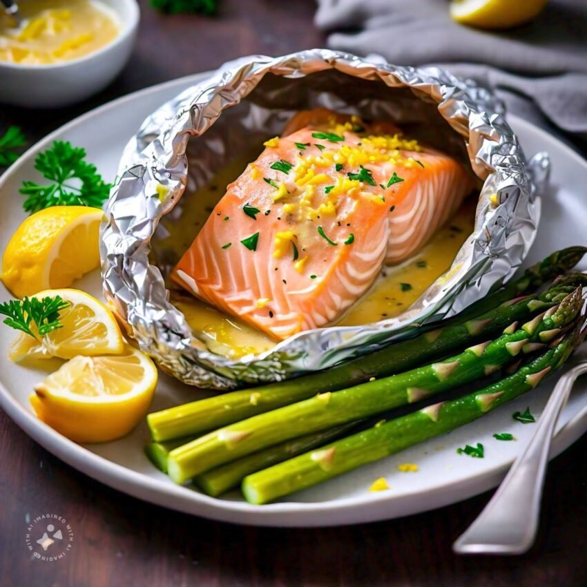3. Assemble the Foil Packets: Cut four 12×12-inch pieces of aluminum foil. Place a salmon fillet in the center of each foil piece. Arrange 3-4 asparagus spears alongside the salmon. Brush the Garlic Lemon Butter Sauce evenly over the salmon and asparagus.