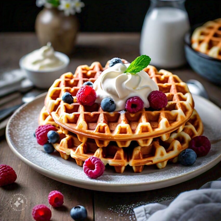 9. Serve the waffles hot with your favorite toppings, such as fresh fruit, whipped cream, maple syrup, or powdered sugar.