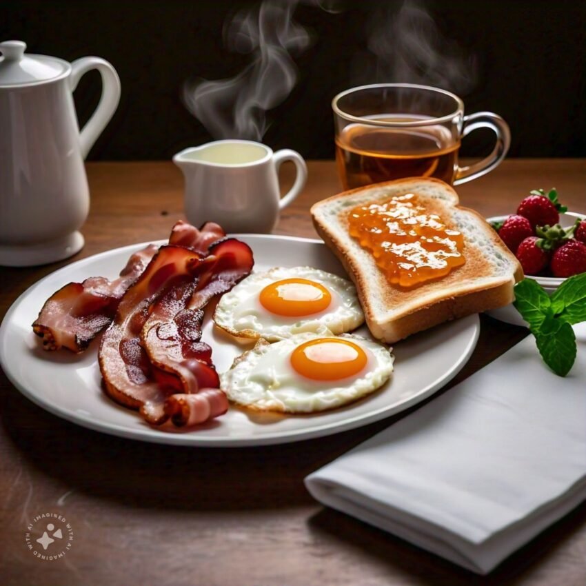 7. Assemble the breakfast: Serve the bacon, sausages, eggs, tomatoes, mushrooms, and baked beans (if using) on a large plate.