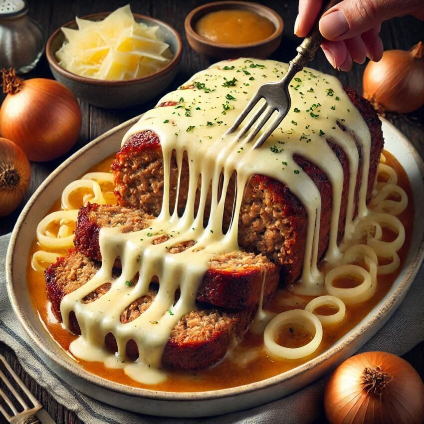 Crockpot French Onion Meatloaf with Melted Swiss Chees