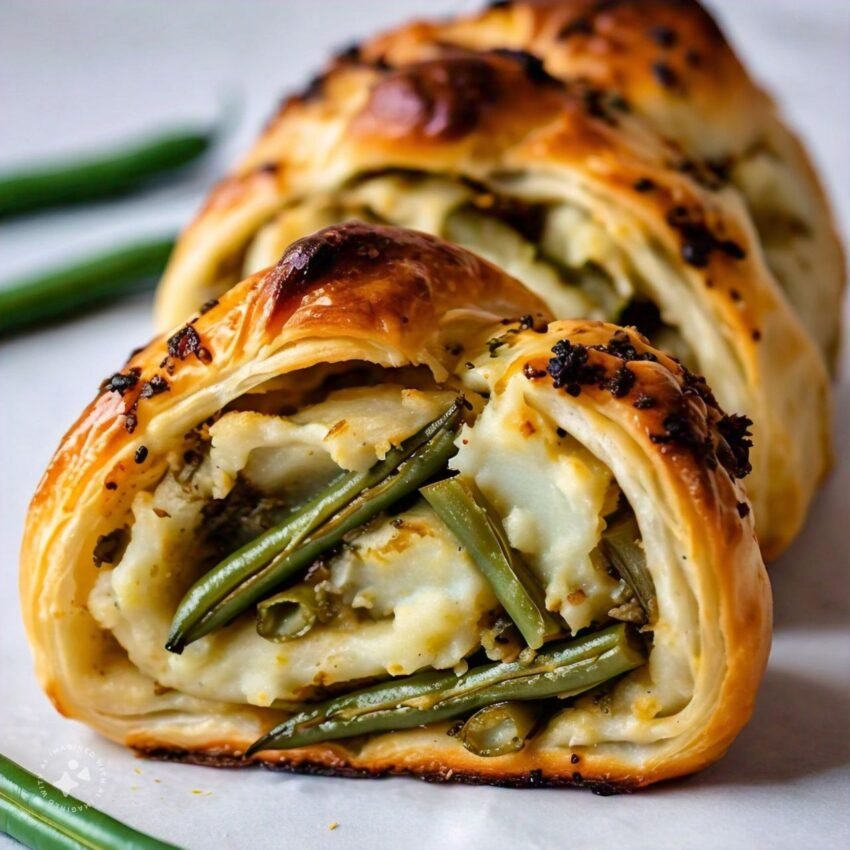 5. Assemble rolls: Divide the risen dough into 6-8 equal pieces. Roll each piece into a ball and flatten into a disk. Place a spoonful of the potato and green bean mixture onto one half of the disk. Add cheese (if using). Fold the other half over to form a half-moon shape. Seal the edges.