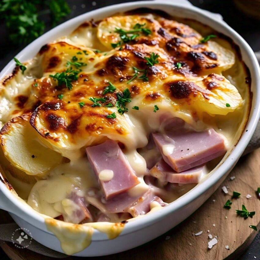 3. Assemble gratin: In a greased 9×13-inch baking dish, create a layer of potatoes. Top with diced ham, then sprinkle with Gruyère and cheddar cheese. Dot the top with softened butter.