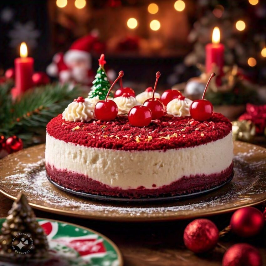 11. Assemble the cheesecake: Place the red velvet cake on top of the cheesecake. Frost with cream cheese frosting.