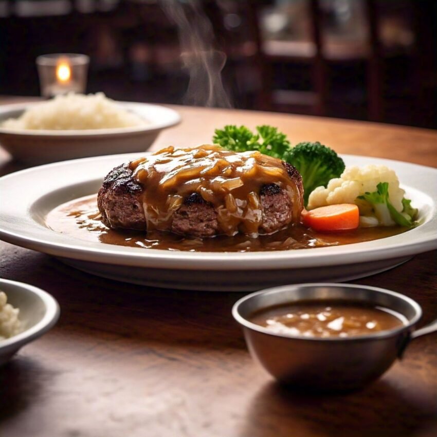 1. Serve the cooked Salisbury steak with the onion gravy spooned over the top.