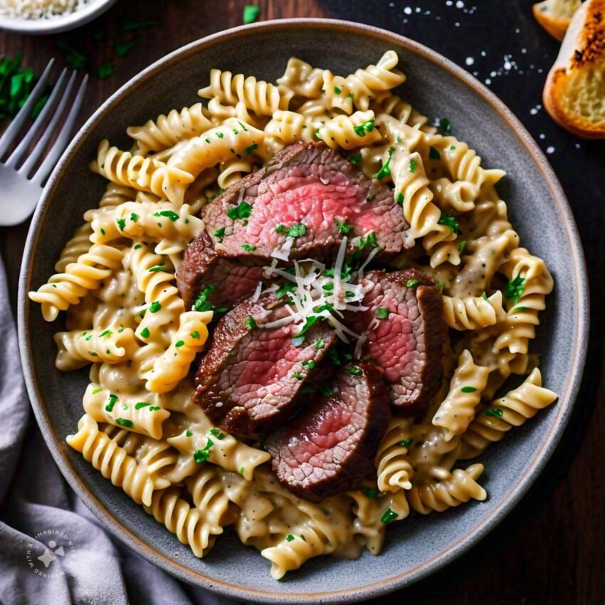 6. Combine pasta and sauce: Add the cooked rotini pasta to the skillet, tossing to coat with the garlic Parmesan sauce. If the sauce seems too thick, add a bit of the reserved pasta water.